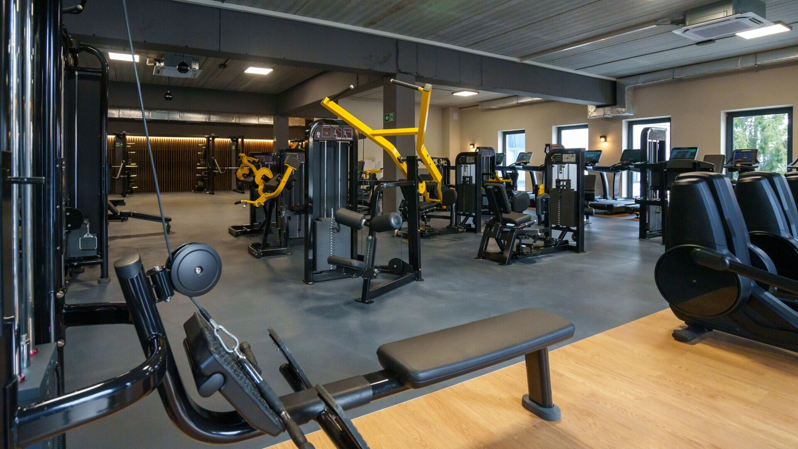 Elegancka przestrzeń fitness w obiekcie hotelowym, gdzie liczy się estetyka, cicha praca urządzeń oraz niezawodność. Zaprojektowaliśmy wyposażenie dopasowane do gości hotelowych, dbając o komfort i bezpieczeństwo użytkowania.